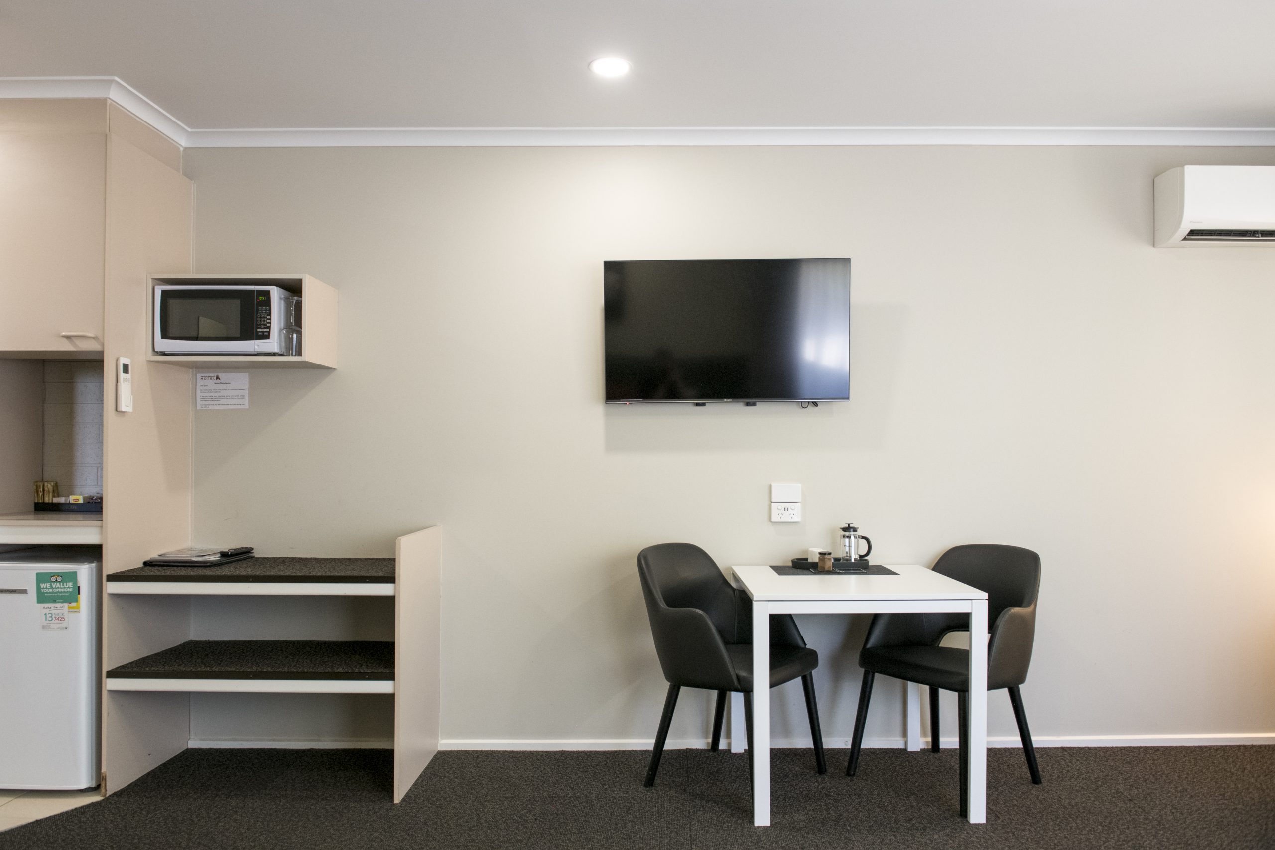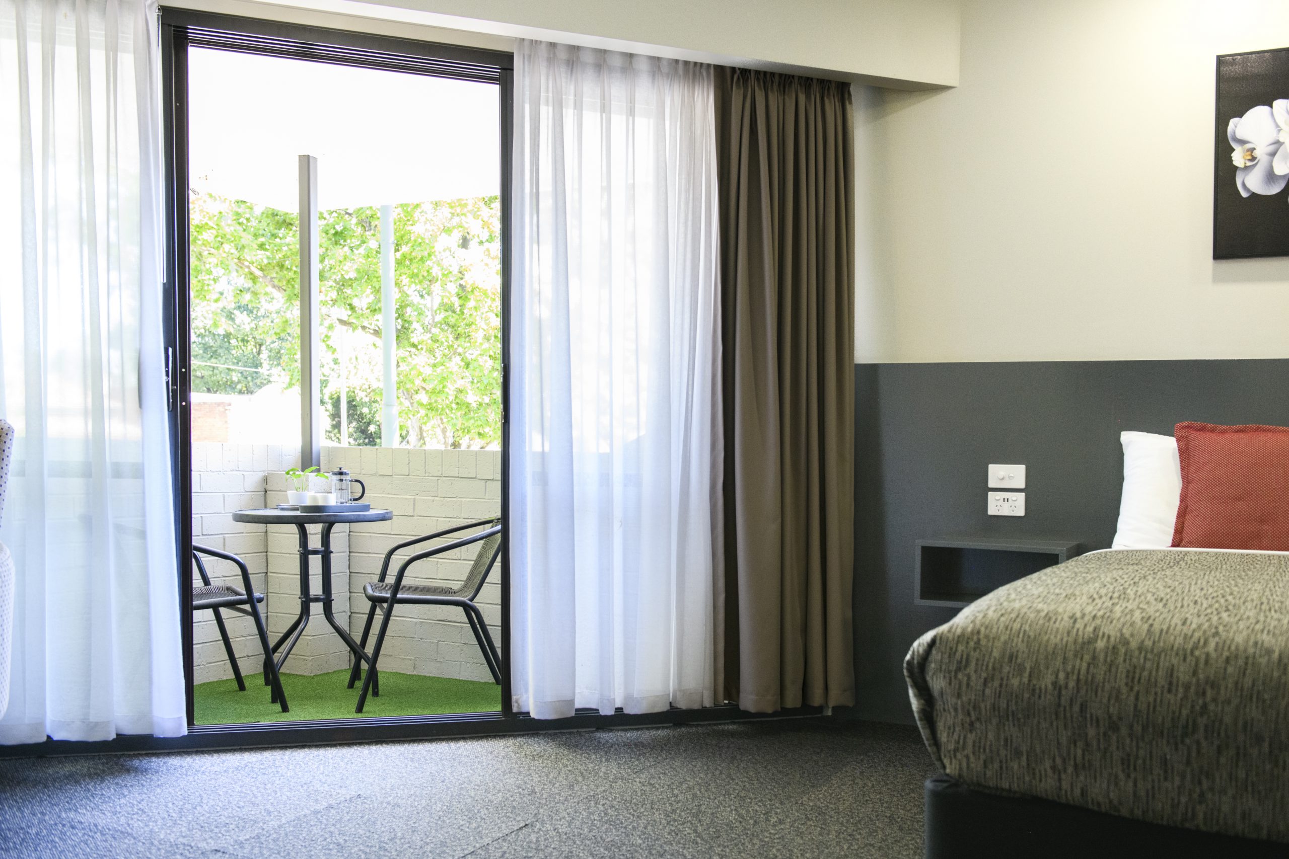 The expansive 32m² room has undergone a delightful refurbishment, featuring a queen bed, dining area, a comfortable sitting space with two reading chairs and a coffee table. Adjacent to the generous main room, there is a balcony offering views toward the city center—ideal for enjoying an evening drink or a morning coffee. The modern and bright bathroom is equipped with a shower, and convenient amenities include a microwave, toaster, and tea/coffee making facilities.